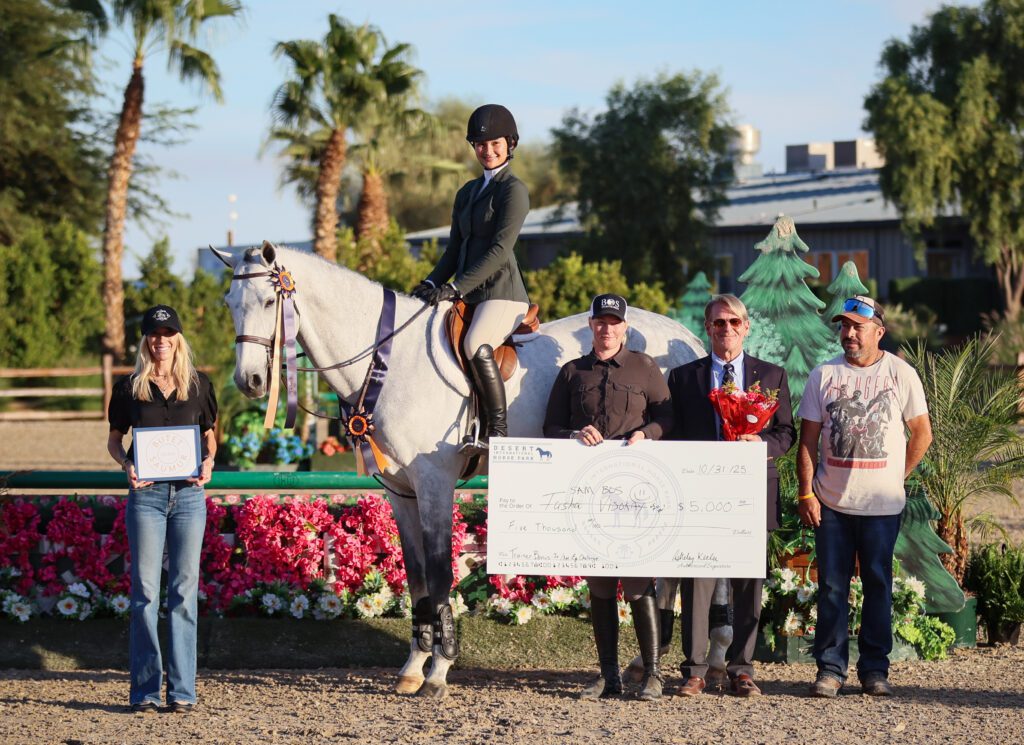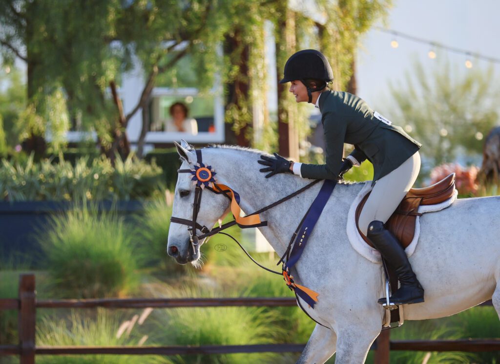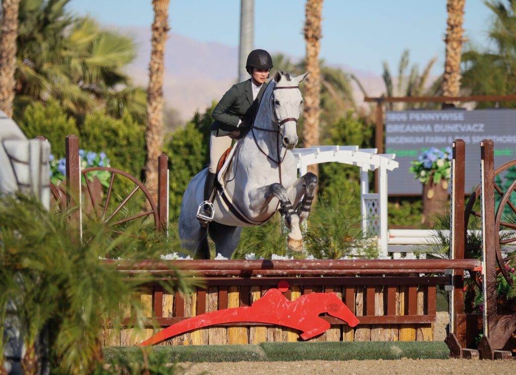 Watching Breanna Bunevacz ride Pennywise around the Main Hunter Ring at Desert International Horse Park, one would never guess that Bunevacz just sat on the 9-year-old Zangersheide gelding for the first time this week. On Friday, October 31, Bunevacz piloted the catch ride straight to the top of the leaderboard, taking home the win in the 3’ DIHP Junior/Amateur Eq Challenge, sponsored by Butet.