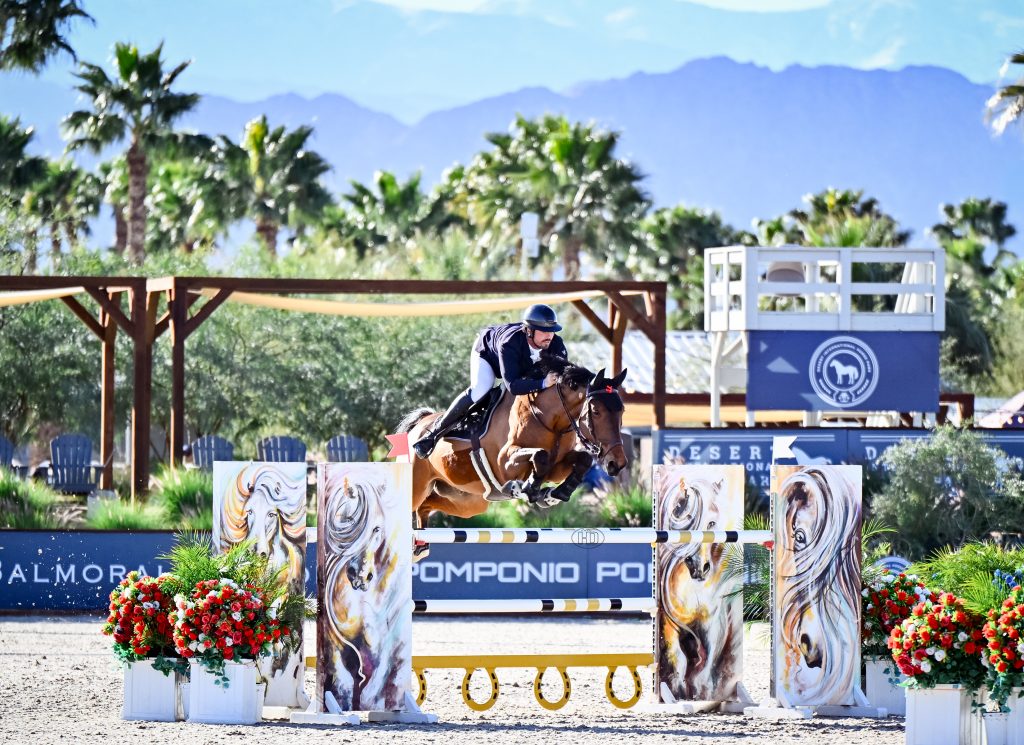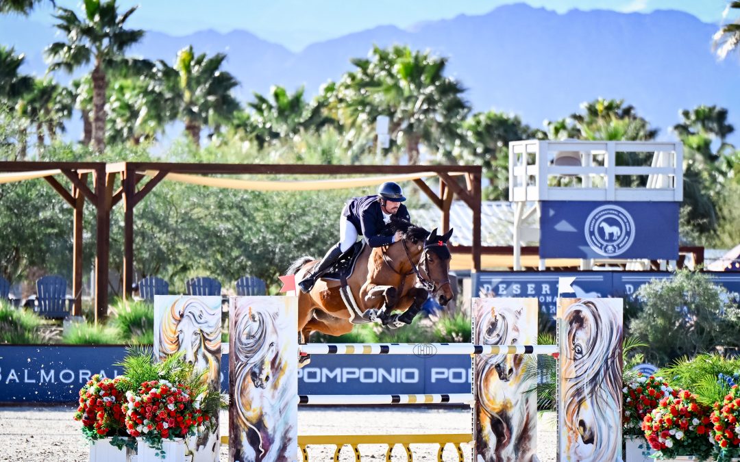 Thermal, Calif. – Braden James thinks the future looks quite bright for 9-year-old Hermes des Carmilles, and the gelding’s performance in the $24,999 Marshall+Sterling 1.40m Open Classic held on February 20 certainly indicated the same. James and Hermes des Carmilles topped a 53-horse field to take home the win in the class, held as part of Desert Circuit 7 at Desert International Horse Park.