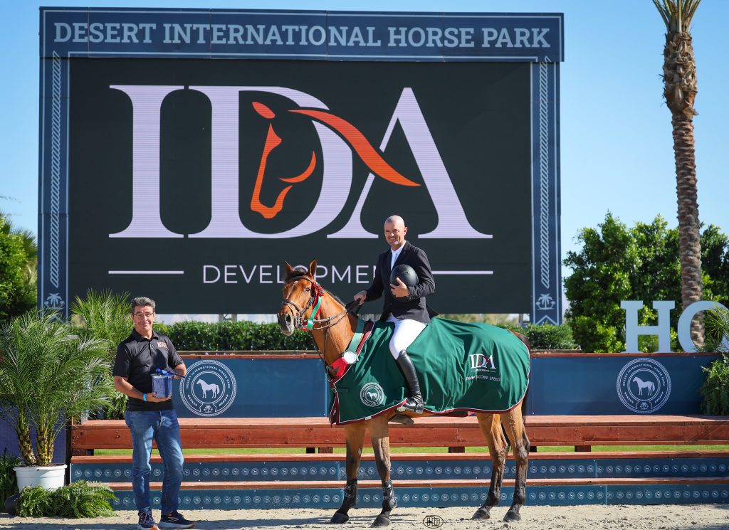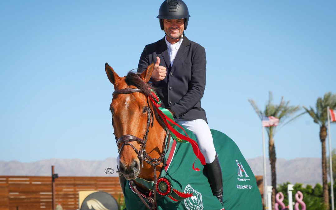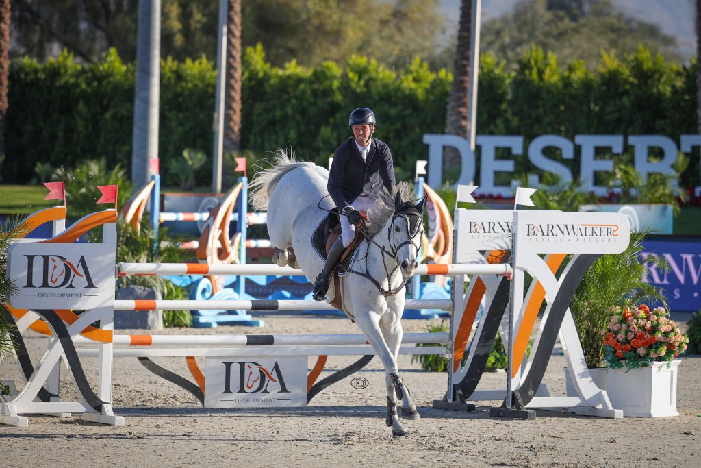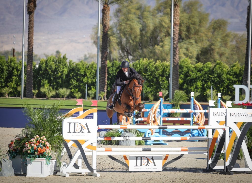 Thermal, Calif. – Topping the 94-horse field to win Wednesday, December 3’s $10,000 IDA Development 1.35m Welcome Speed required putting the pedal to the metal. Fortunately, that is something David Sterckx is extremely familiar with, and he piloted Episode de Vains to victory to kick off Desert Holiday 1 at Desert International Horse Park in Thermal, Calif.