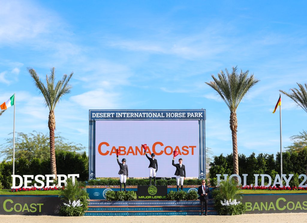 Stella Wasserman, Erynn Ballard and Tony Stormanns topped the podium in the $62,500 Cabana Coast CSI2* Grand Prix. Photo by High Desert Sport Photo