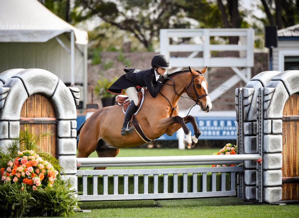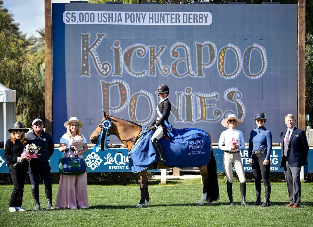 Thermal, Calif. – Some of Desert Circuit’s smallest competitors took to the show’s biggest field on Friday, January 24, for the $5,000 Kickapoo Ponies USHJA Pony Hunt & Go Derby. From a starting list of 23 ponies, the win on the Grass Field at Desert International Horse Park went to Hannah Hutter and Galway.