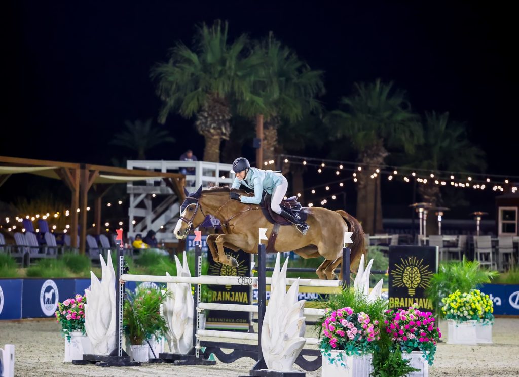 Thermal, Calif. – Jamie Sailor planned to just go “medium” pace in the jump-off for the $10,000 Stal Hendrix DIHP 10 & Under Futurity 1.35m. However, her mount, Mad Money TW, quickly showed he was ready for more, ultimately resulting in the pair’s win in the Friday, January 23, class, held under the lights at Desert International Horse Park in Thermal, Calif.