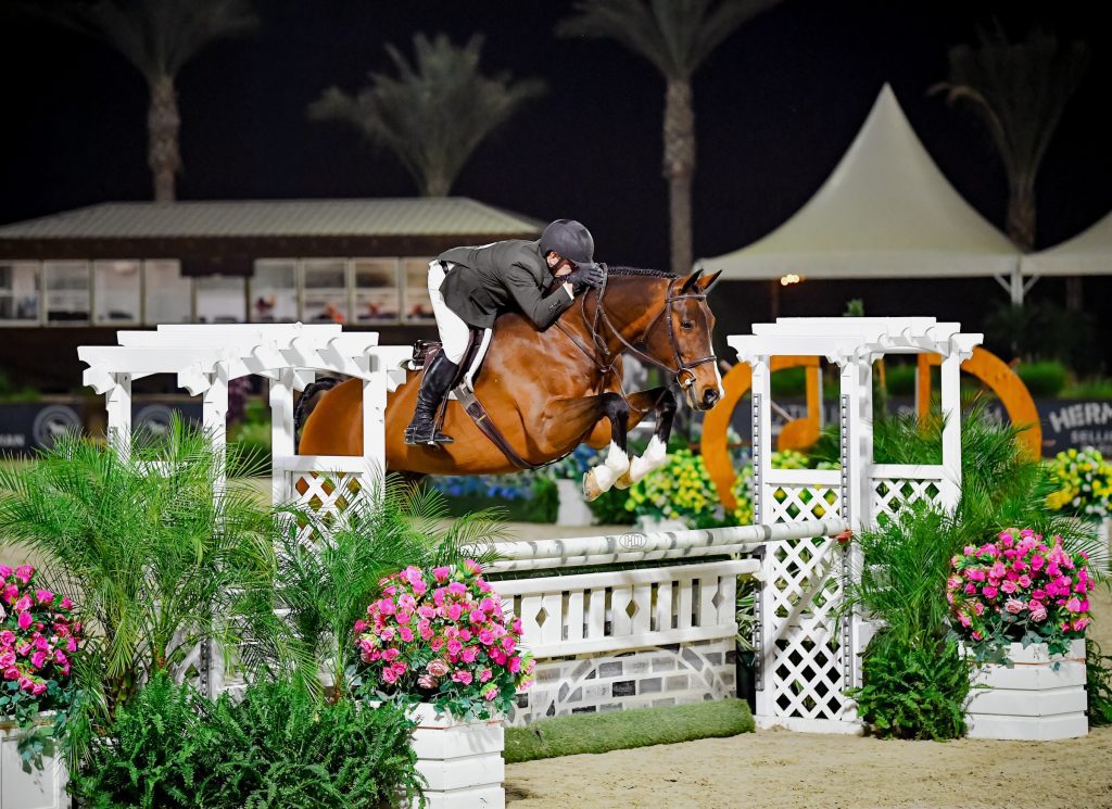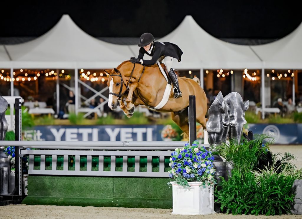 Before contesting the Saturday night featured event, all horse and rider combinations had to first qualify by finishing either first or second in any rated hunter class at 3’6” or above during the week’s World Championship Hunter Rider competition. Those qualified entries were then invited to take on Saturday night’s one-round course, set under the lights of the Grand Prix Stadium and designed by Kevin Holowack.
