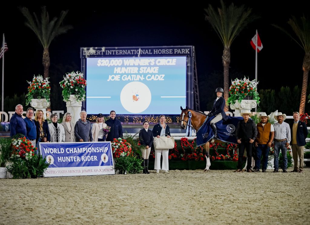 Thermal, Calif. – At just 7 years old, Cadiz bested a field of 22 of Desert International Horse Park’s top hunters to win the $20,000 Winners Circle Hunter Stake, presented by Frank & Eileen. Joie Gatlin piloted the Westphalian gelding to a score of 92 to take home the victory in the class held on February 7, at Desert Circuit 5.