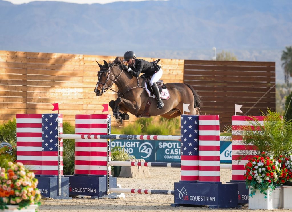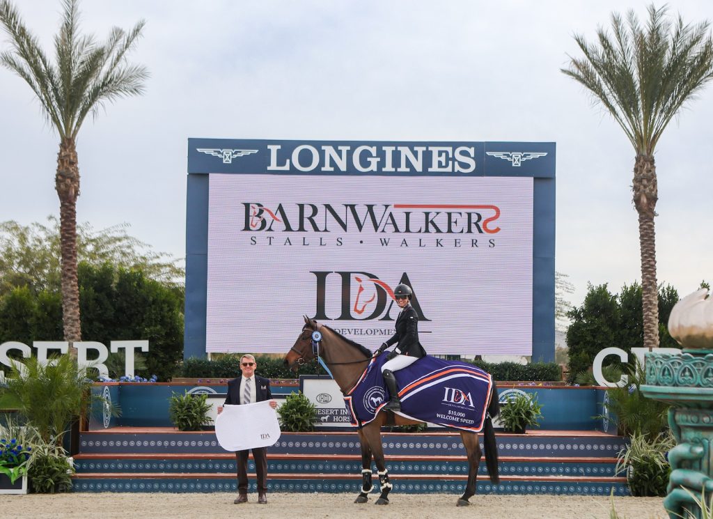 Thermal, Calif. – Karrie Rufer concluded Desert Circuit 3 with a win, and on Wednesday, January 28, she kicked off Desert Circuit 4 the same way, this time topping the $10,000 IDA Development 1.35m Welcome Speed aboard Mr. Europe.