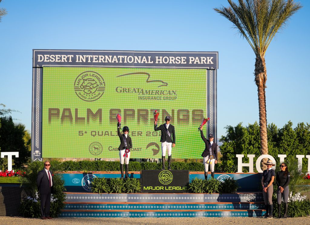 Callie Schott, Mark Bluman and Laura Kraut atop the podium for the $182,000 Great American Insurance Group CSI5*. Photo by High Desert Sport Photo