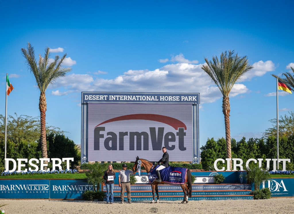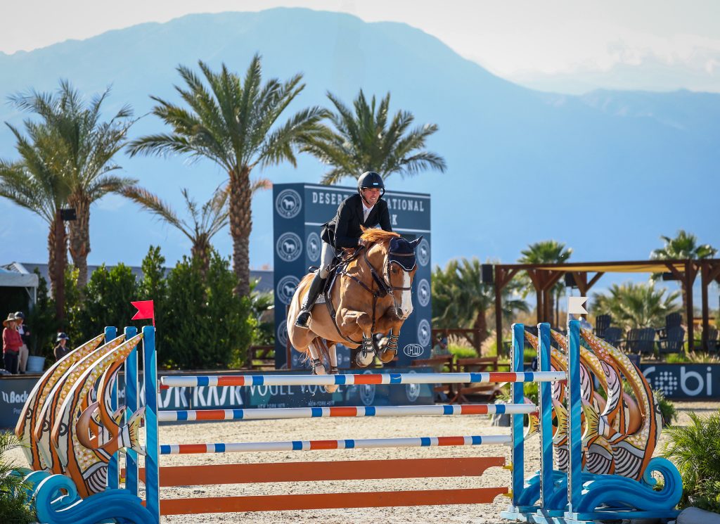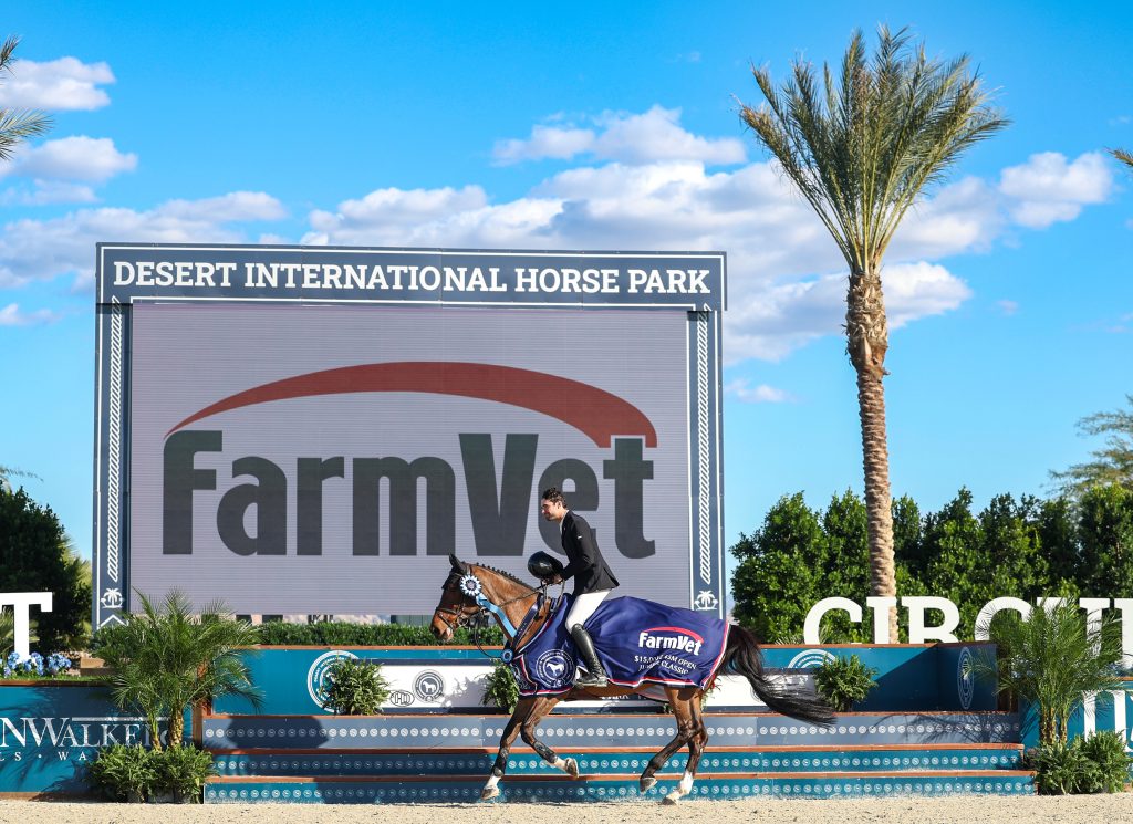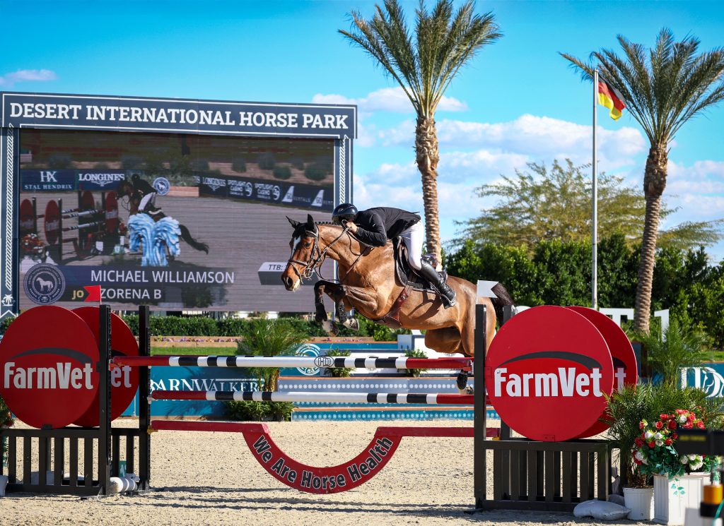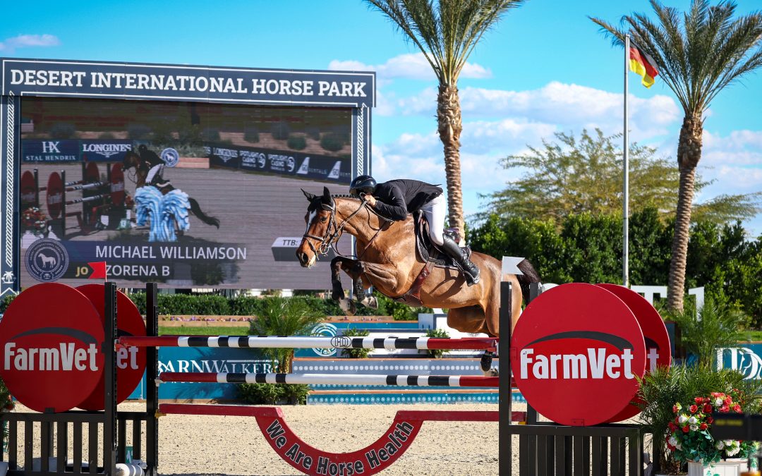 Thermal, Calif. – With Michael Williamson at the helm, Azorena B made her Desert Circuit debut week a winning one as the mare took home the top honor in Thursday’s $15,000 FarmVet 1.45m Open Classic.
