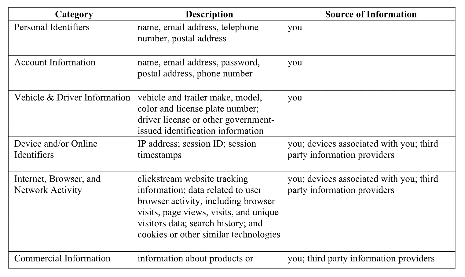 The categories below describe the personal information we have collected in the past twelve months or may collect about you and the sources from which we collect those categories of personal information.