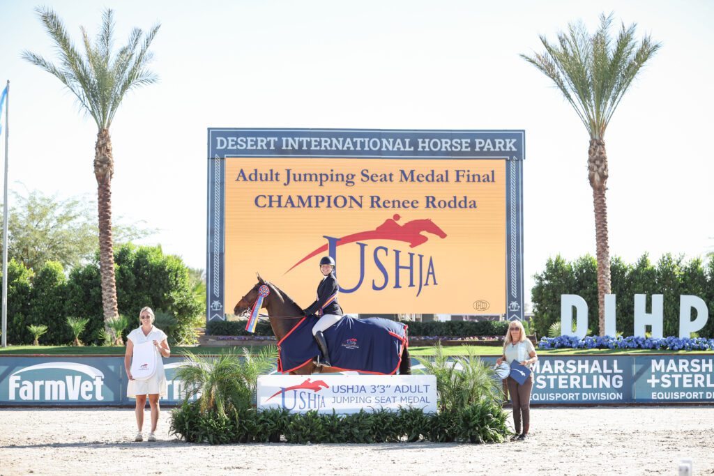 After topping the USHJA Gladstone Cup Equitation Classic for Amateurs – West on Friday, Rodda and her mount, Cheval, returned to also take the win in the USHJA 3’3″ Adult Jumping Seat Medal Final – West, held November 1-2, during National Sunshine Series 1 in Thermal, Calif.