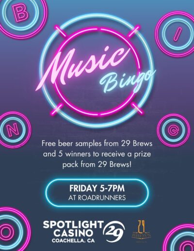 Join us at Roadrunners to test your music knowledge with 5 rounds of music bingo! Know your songs within the first 30 seconds? Each round winner will receive a special prize provided by Spotlight 29 & 29 Brews! |