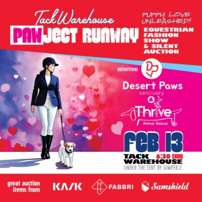 Puppy Love Unleashed! Equestrian Fashion Show and Silent Auction to benefit Desert Paws & Thrive Animal Rescue! Under the tent by Jumper 2 on Vendor Row. |